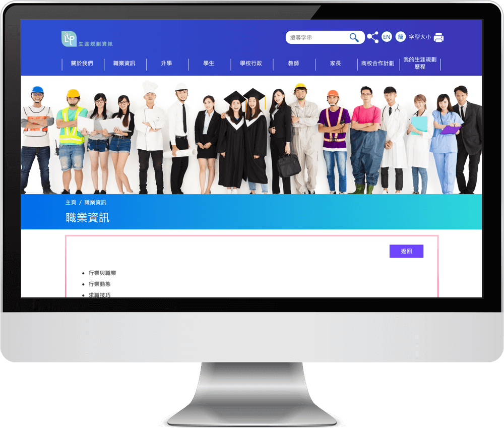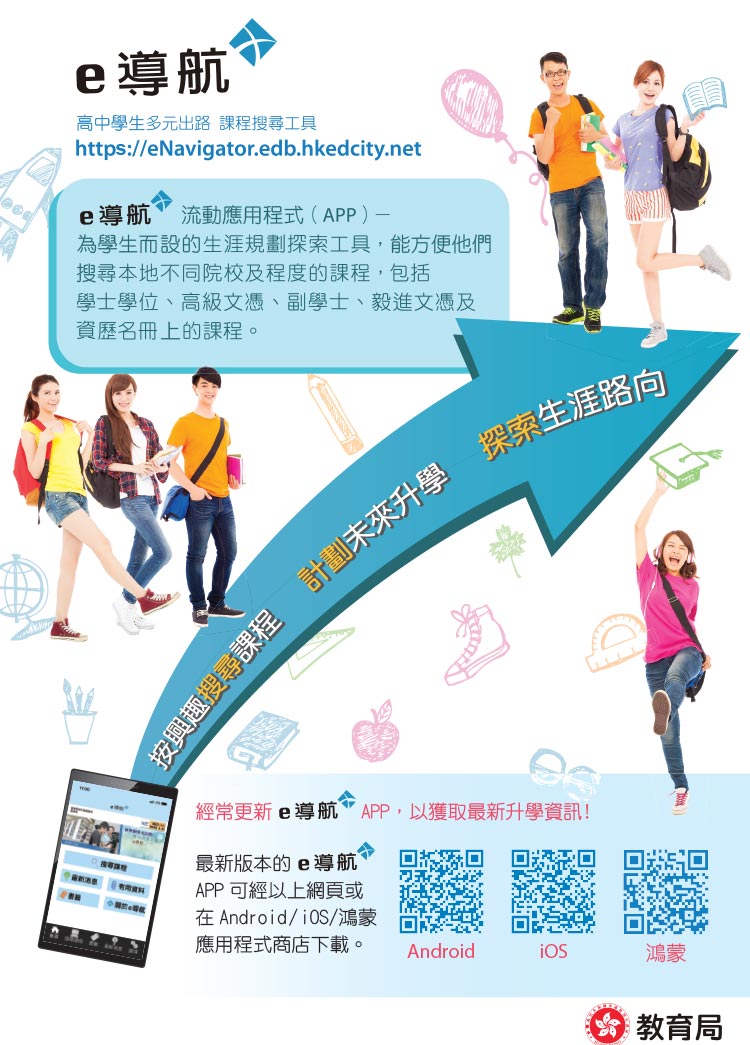 「e 導航」 流動應用程式 (APP) ─ 為學生而設的生涯規劃探索工具,能方便他們搜尋本地不同院校及程度的課程,包括學士學位、高級文憑丶副學士丶毅進文憑及資歷名冊上的課程。學生可經常更新 「e 導航」 APP 以獲取最新升學資訊。